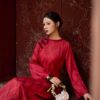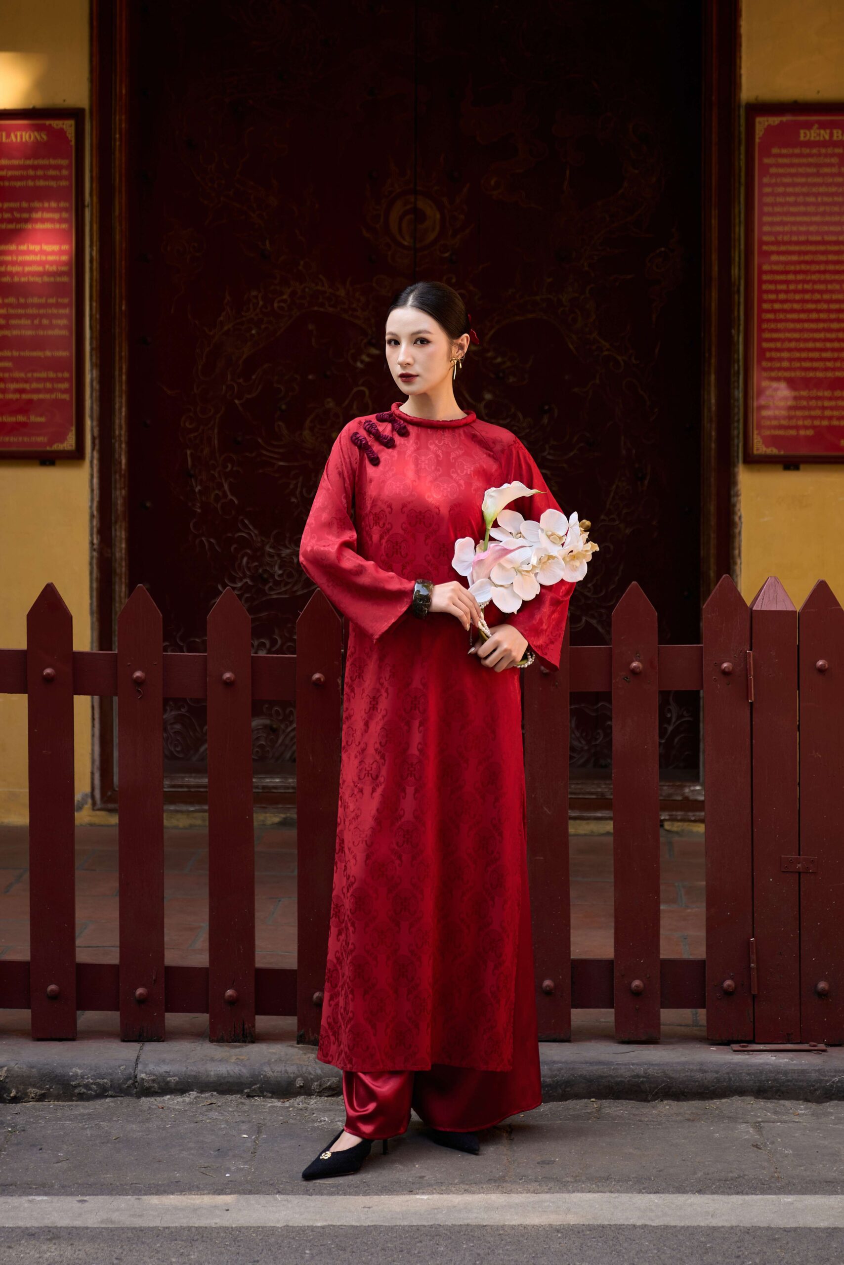 ▪️ Quần: Lụa trơn sắc đỏ rượu vang – lớp nền tạo chiều sâu, cân bằng hoàn hảo với hoa văn đen ánh trên nền áo.